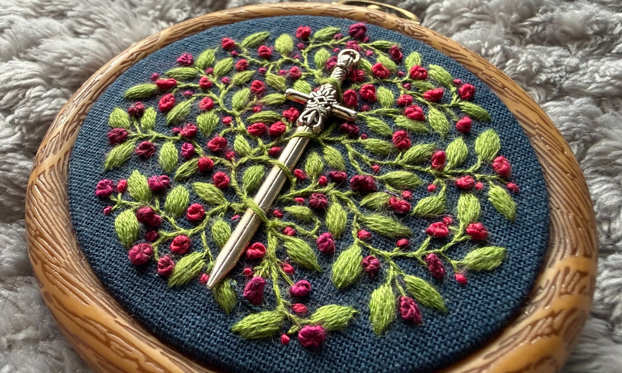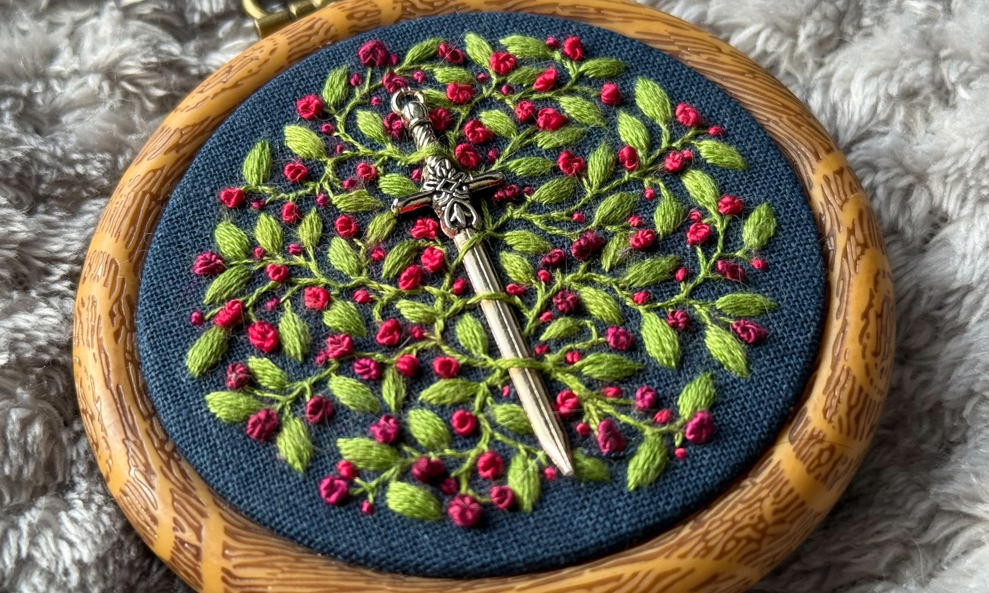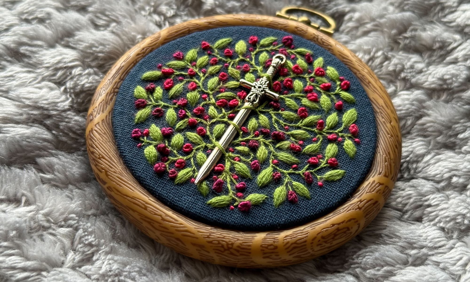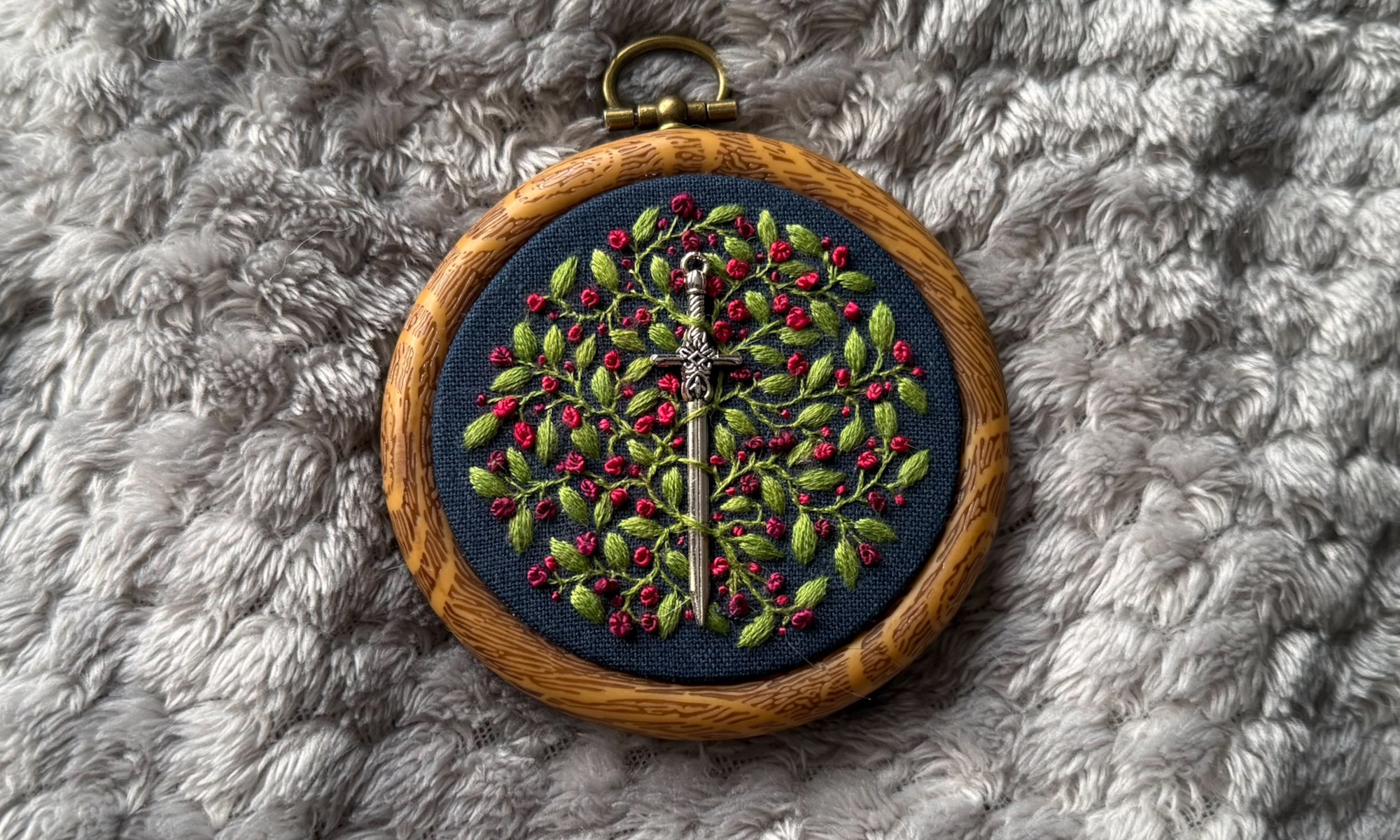 In this piece, the vines are fuller and more tightly woven, forming an almost wreath-like shape around the blade. Small pink flowers are scattered throughout, giving the embroidery a sense of abundance and quiet persistence, as though the sword has been left in place long enough for nature to fully settle around it. The blade remains visible, but no longer dominant; it feels supported, even protected, by what’s grown around it.