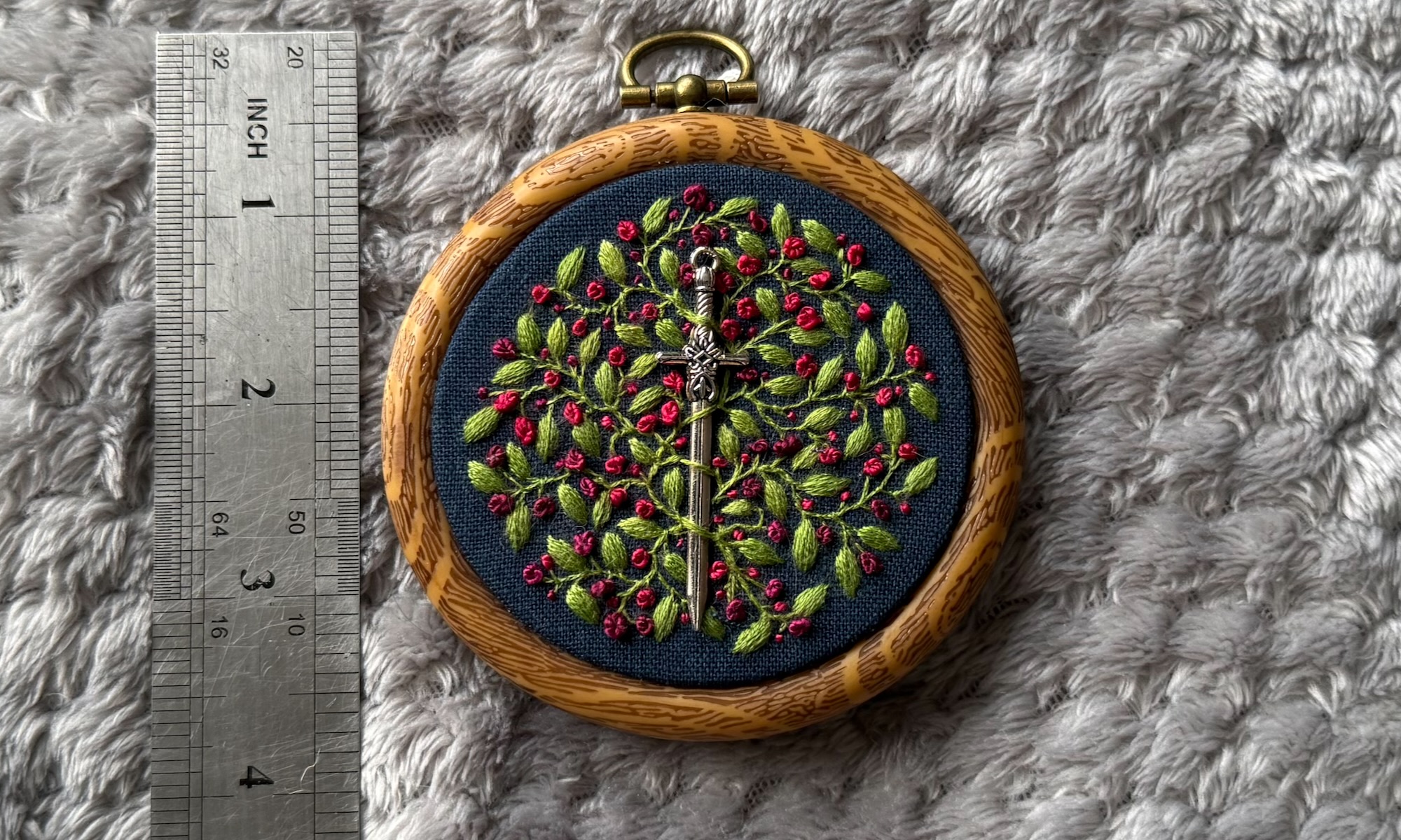 Bloom & Blade I is framed in a faux wood embroidery hoop that measures 8.5cm (~3.5") tall and wide. With the hanging hardware the total height is around 10cm (~4"), though this can be unscrewed if not desired. It is intended to be kept in the hoop and hung up for display, preferably out of direct intense sunlight. Materials used include the sword which is made from zinc alloy, cotton fabric, regular DMC stranded cotton threads.