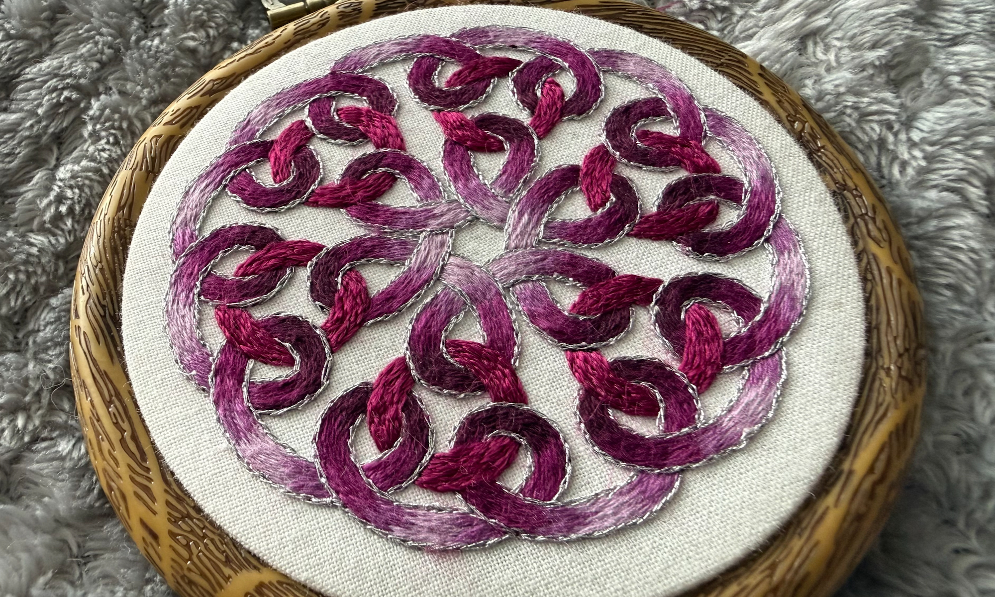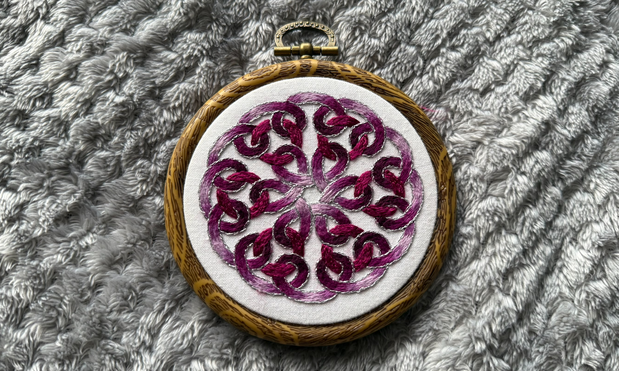 This piece was stitched by hand with careful colour blending to give the knotwork depth and movement, allowing each curve to feel gently alive rather than rigid. The hoop itself adds to the warmth of the piece, framing it in a way that highlights the harmony of the design.