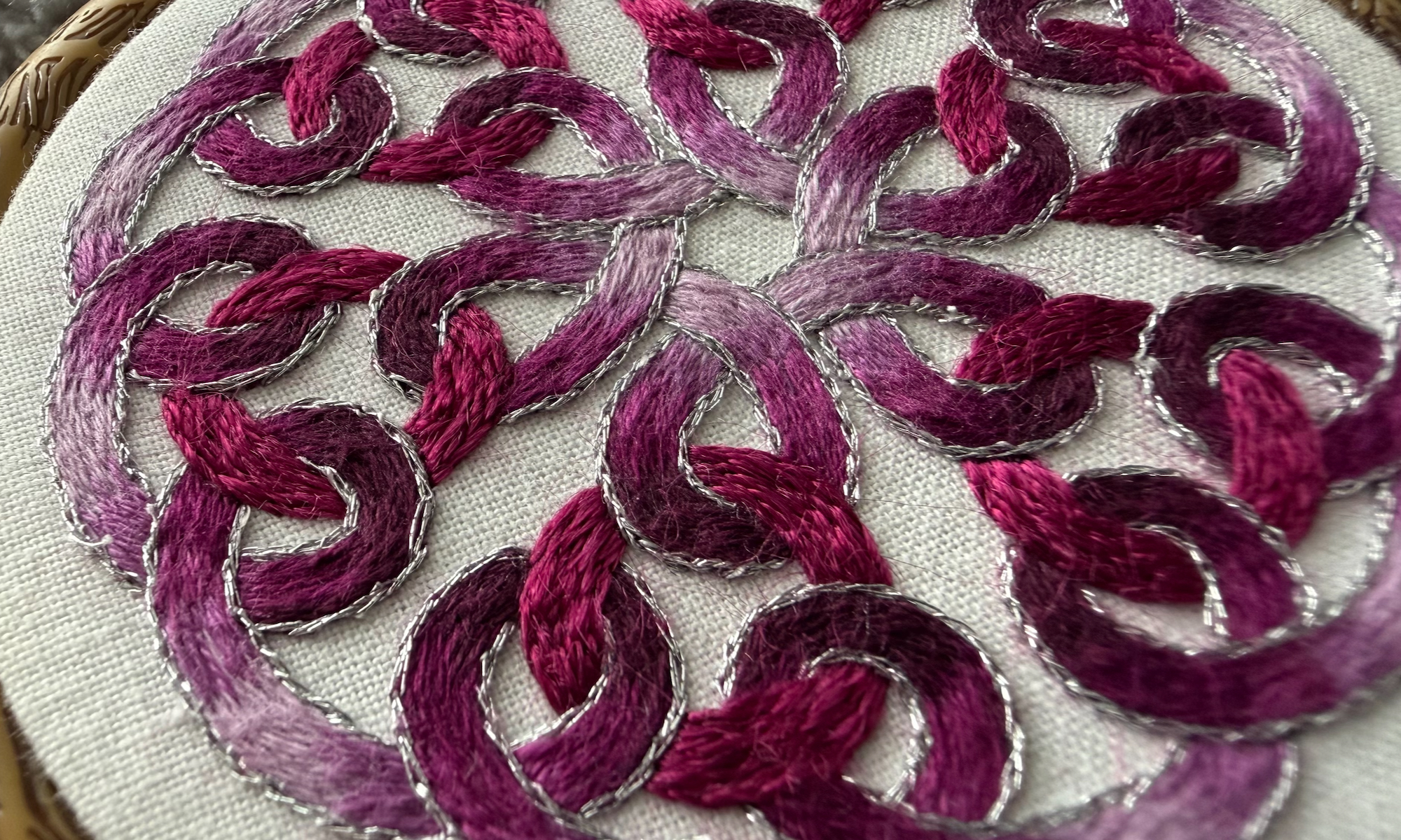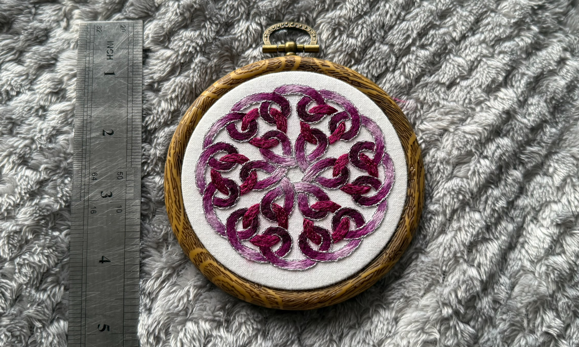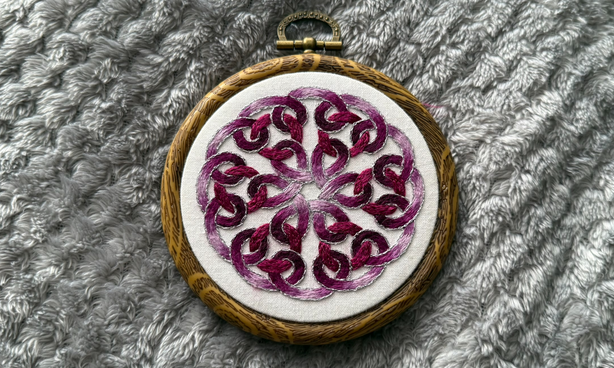 Everwoven Heart is a one-of-a-kind embroidery built around a Celtic knotwork design, stitched in a soft gradient of rose & mauve. The interlaced lines loop and fold in continuous pathways, creating a rhythmic pattern that feels both grounded and quietly enchanting. There’s a meditative quality to the way the shapes flow into one another - like petals turning in a circle, or threads coming together to form something whole.