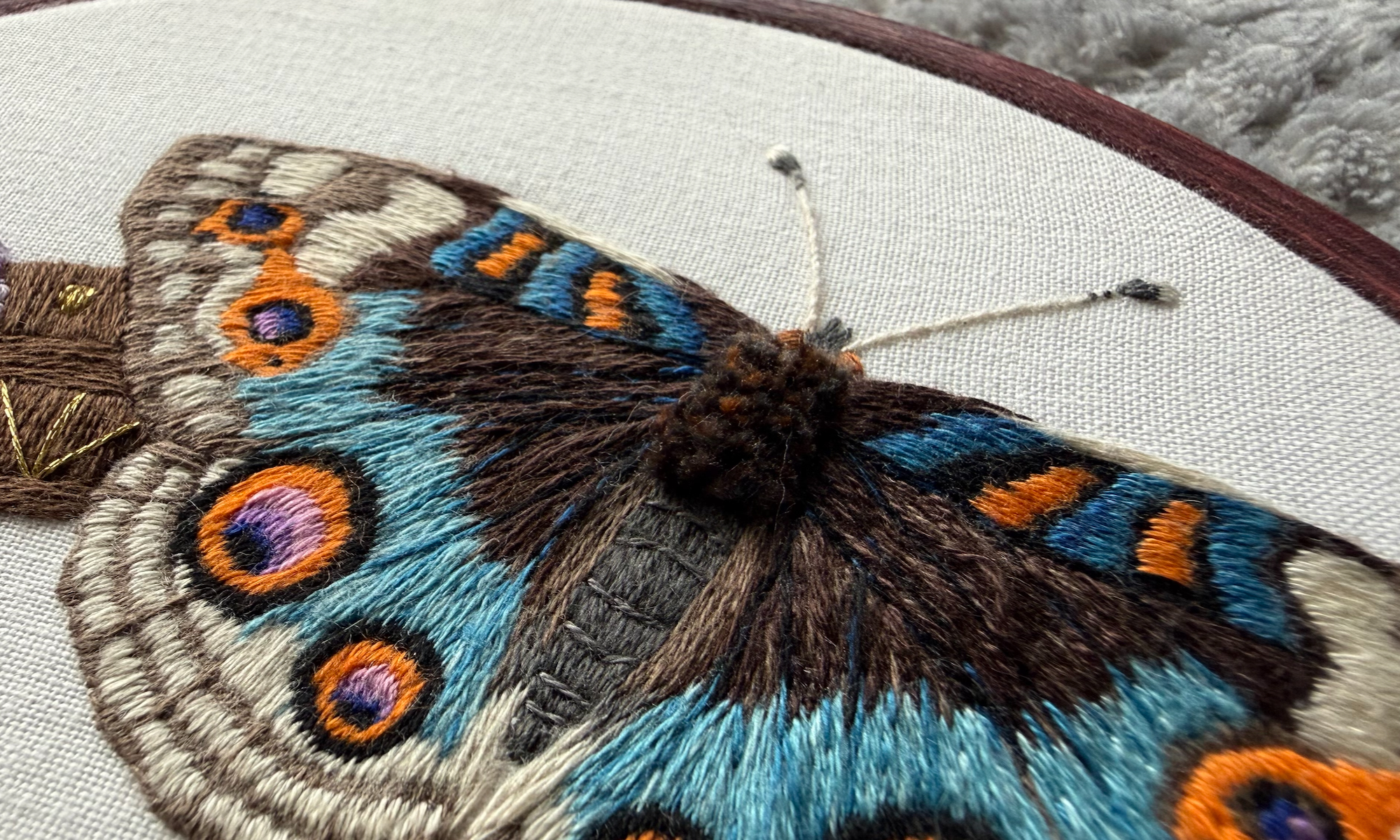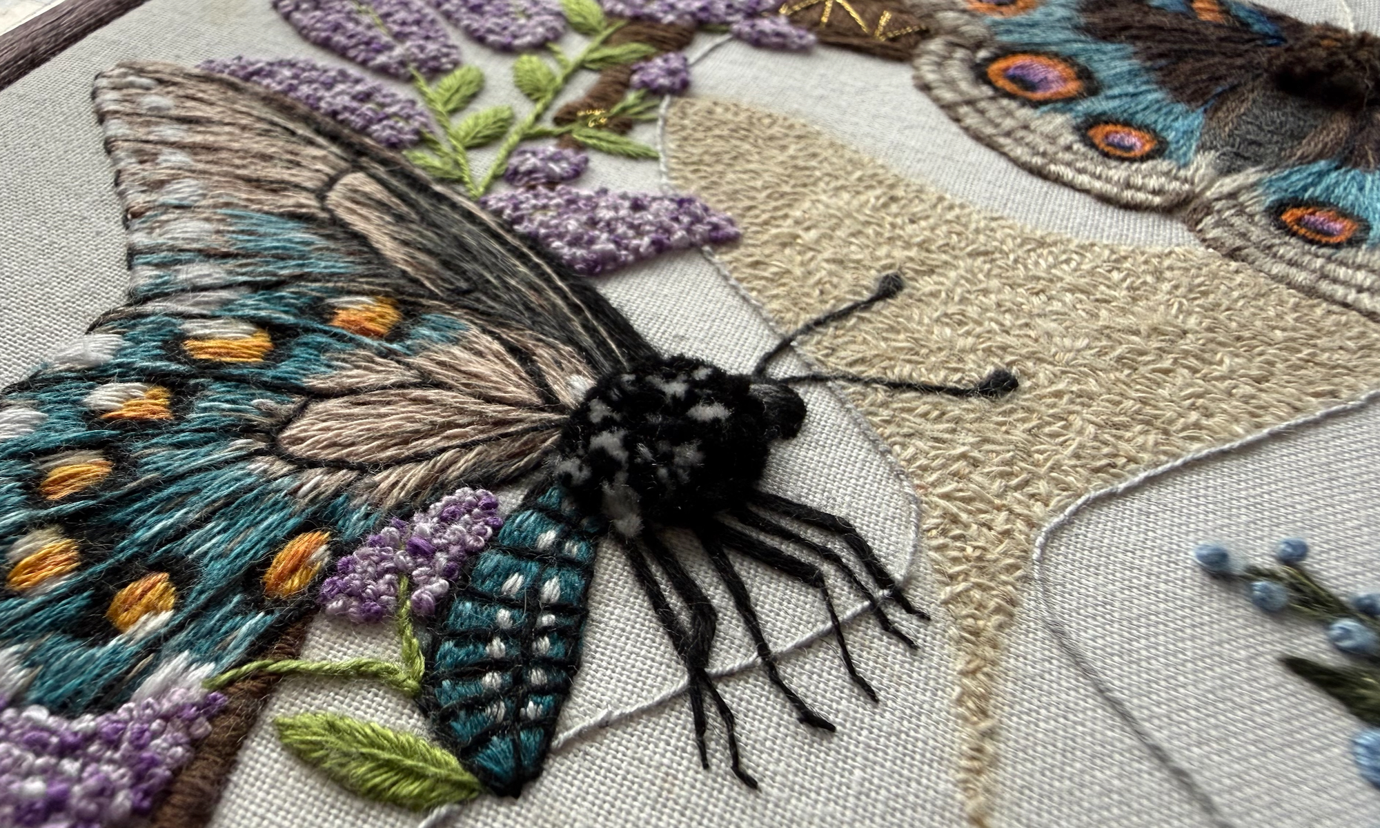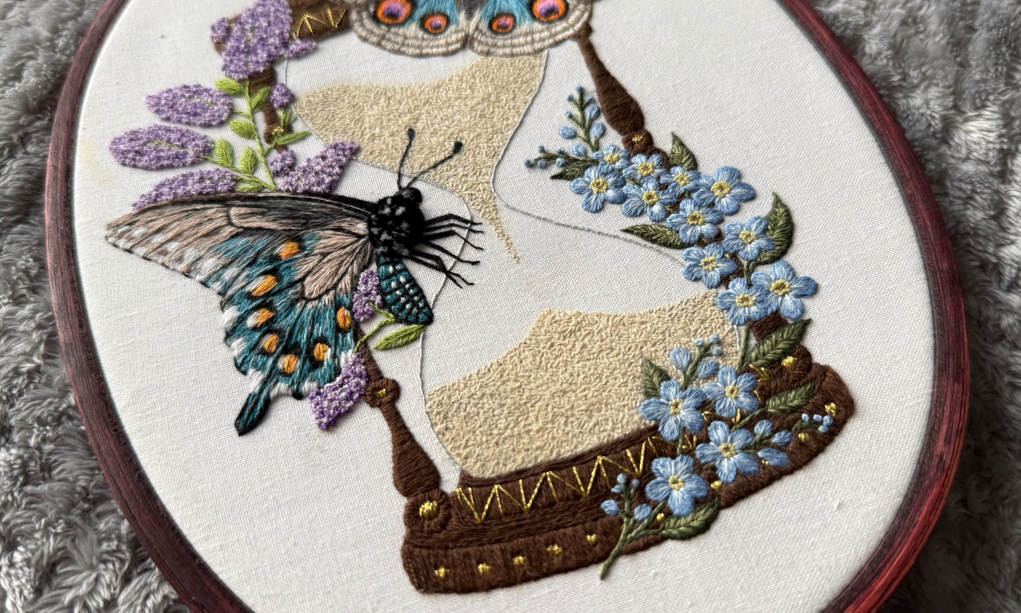 Time Flies is one of my most cherished embroidered pieces - a large artwork stitched slowly and lovingly over many hours. At its centre sits a gently gilded hourglass, its sand caught in a moment of stillness. Around it, lilacs and forget-me-nots climb and curl, adding soft colour and life to the frame. Two butterflies - Junonia orithya and Battus philenor - rest lightly on the hourglass, their wings stitched with layers of fine detail and quiet luminosity.