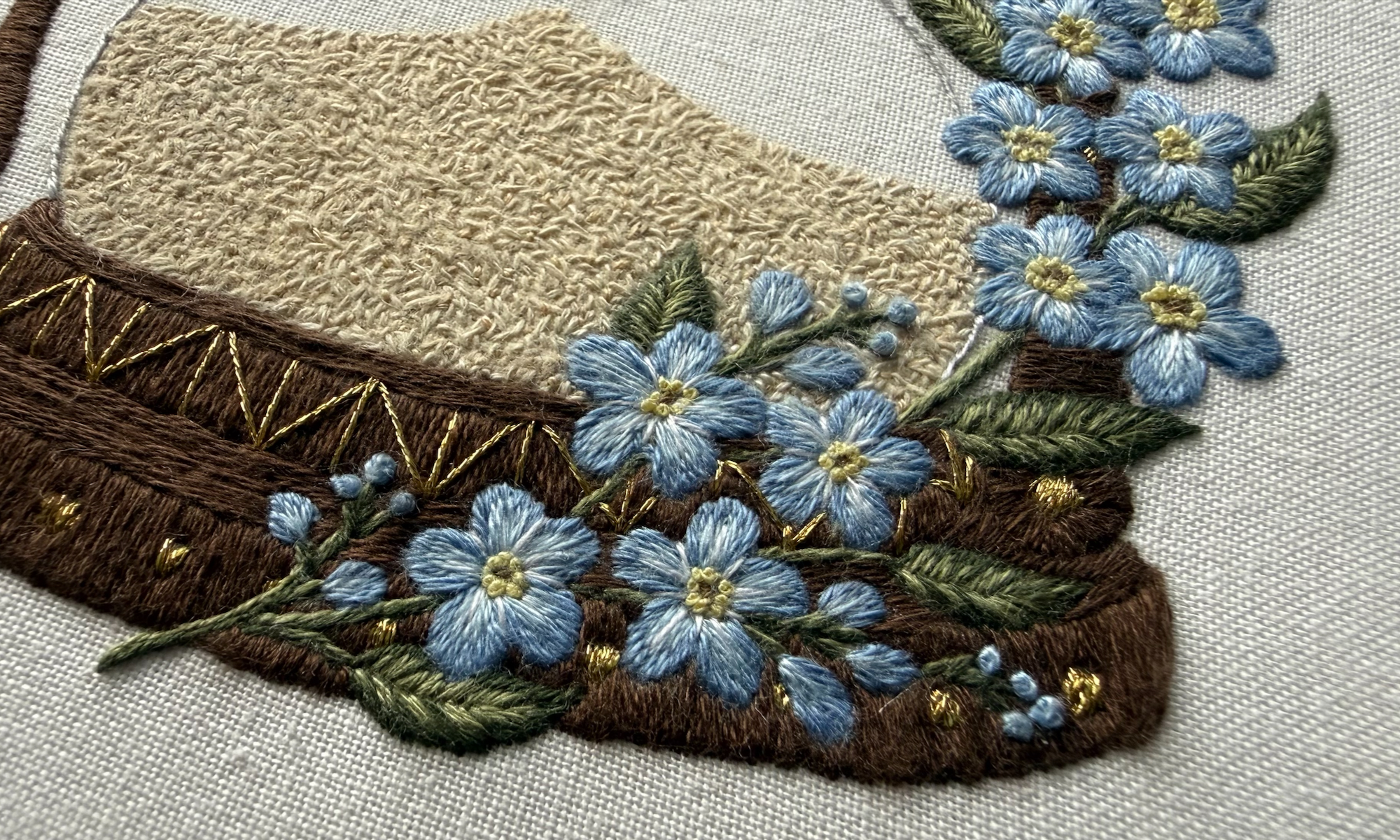 “Time Flies” is a one-of-a-kind embroidered artwork featuring a gilded hourglass embraced by lilacs and forget-me-nots, with two butterflies resting lightly on its frame. Rich in detail and soft colour, this large oval piece explores the fleeting nature of time through delicate, living motifs. A treasured, deeply personal creation.