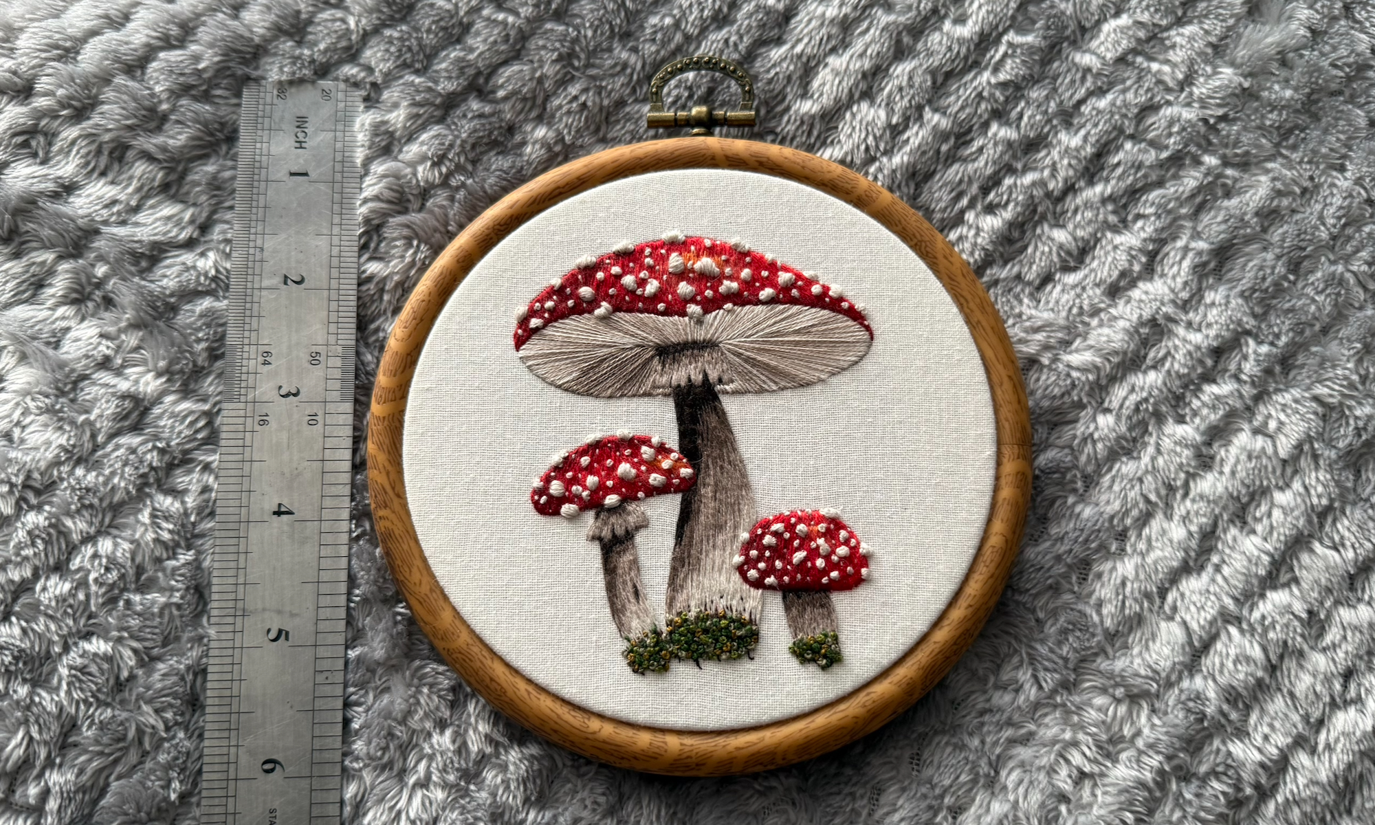 This piece was stitched while developing the pattern after stitching many mushrooms previously, so it carries all the small refinements, colour choices, and attention that go into a finished design. The mushrooms are shaded using single-strand embroidery to create gentle transitions and a natural, organic look. It’s a simple motif, but there’s a lovely quietness to it - something grounding and easy to spend time with.